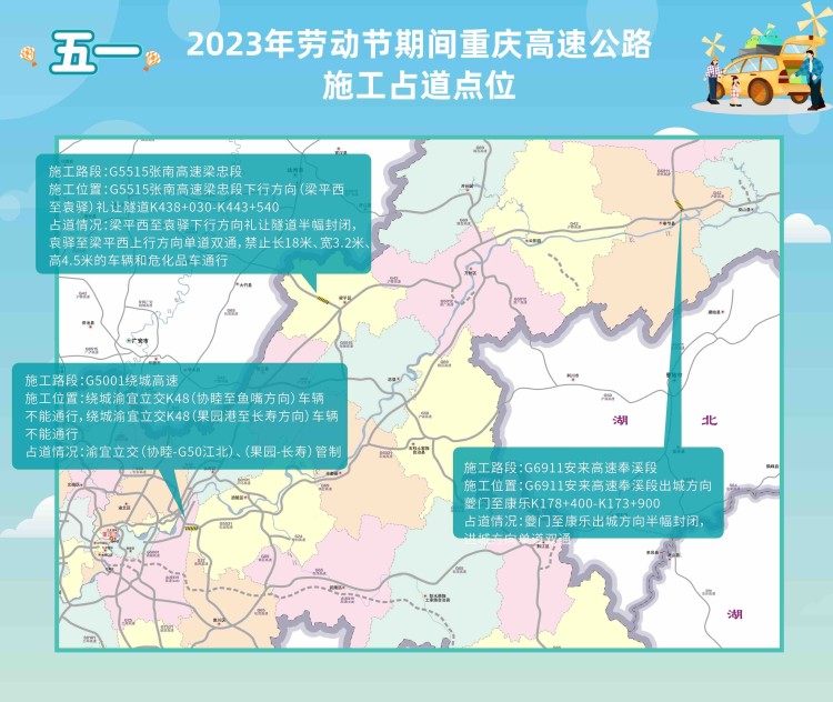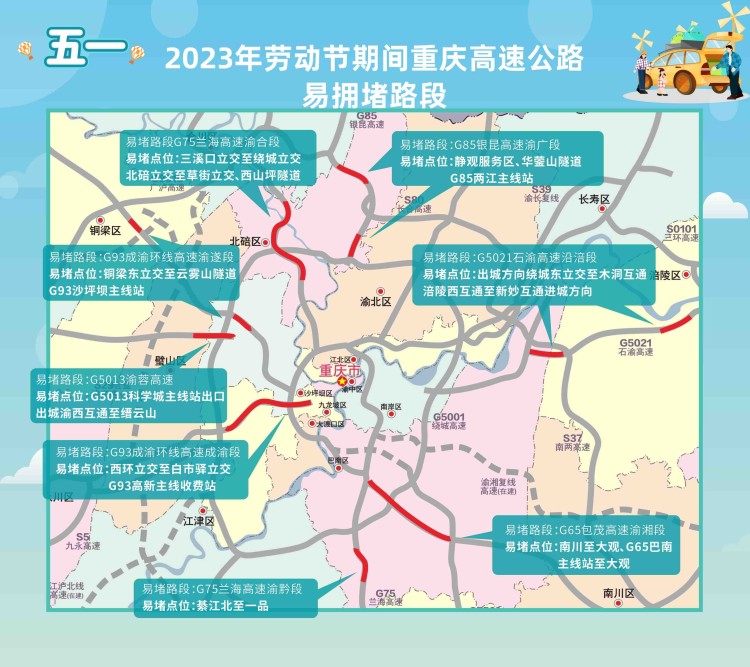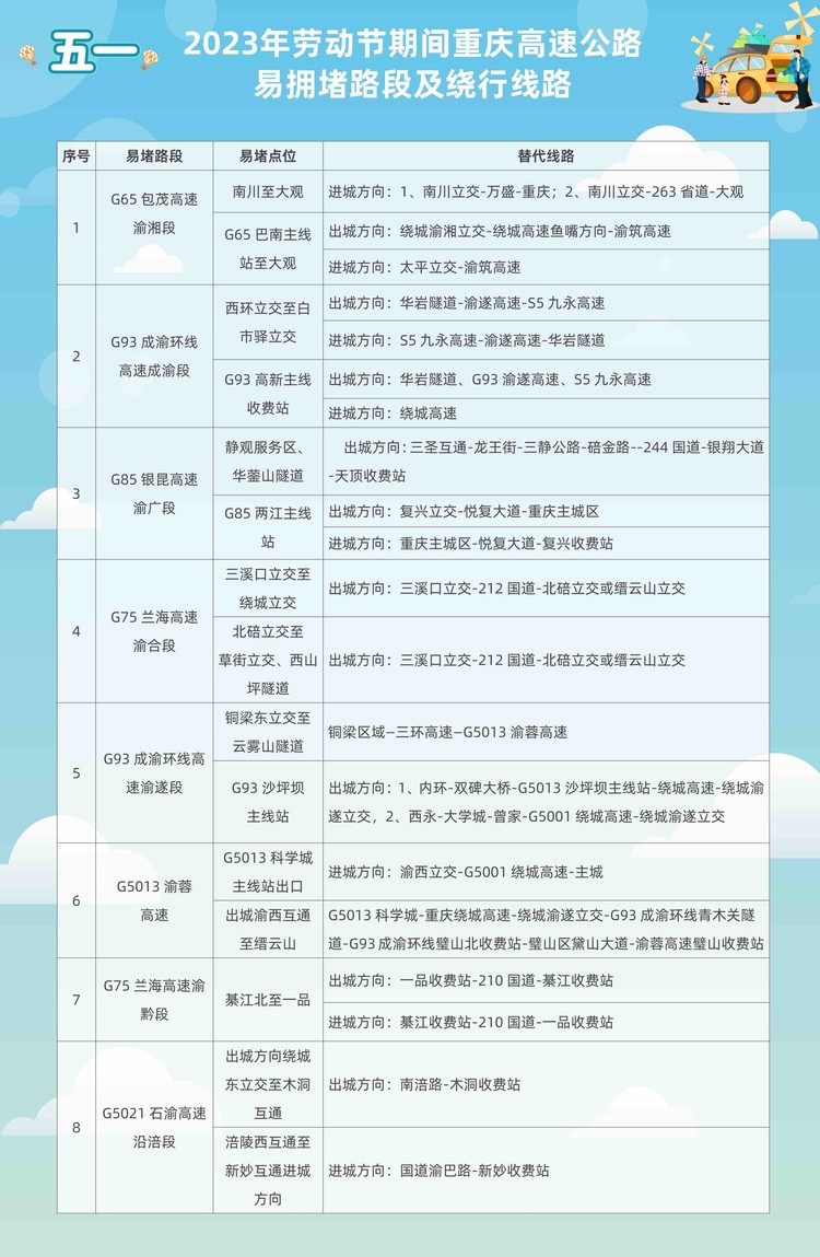 “五一”期间,容易拥堵点路段有:G65包茂高速渝湘段南川至大观、G85银昆高速渝广段、G5013渝蓉高速 、G5021石渝高速沿涪段等路段。