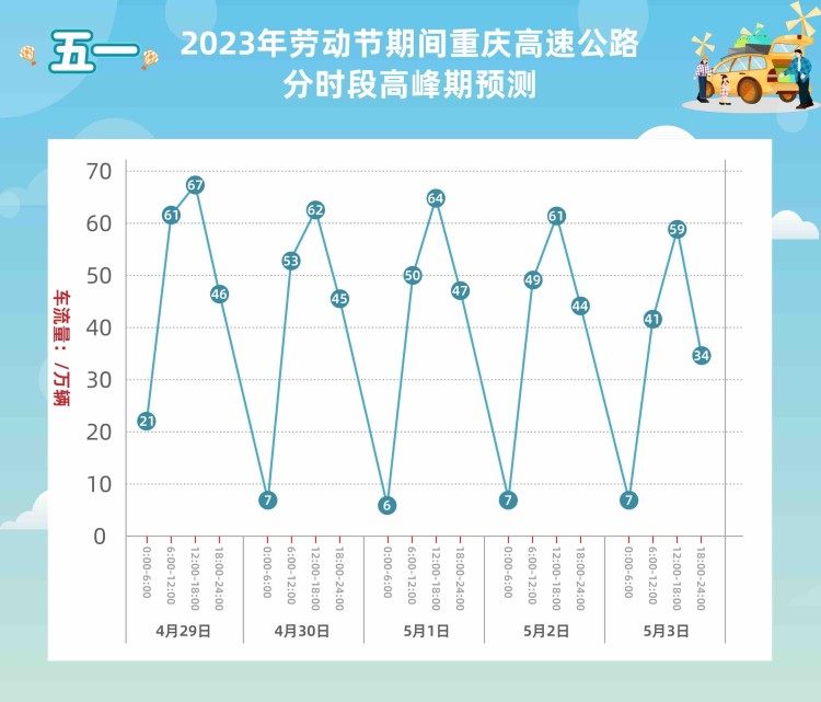 4月25日,重庆高速集团介绍,今年“五一”期间,预计全路网车流量约892.8万辆次,4月29日单日车流最高,约194万辆次,首波出行高峰预计在29日10时左右出现。重庆高速集团制定了出行服务指南,方便广大市民出行。