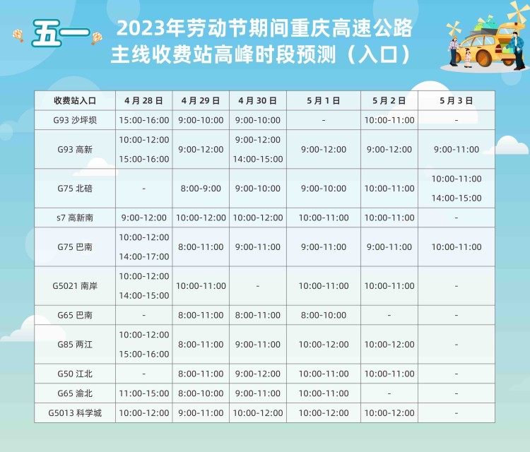 需要提醒的是:假日期间计划出行的市民,请合理安排出行时间,提前掌握沿途路况和天气情况,尽量避峰、错峰出行,避免拥堵。行驶途中遇到突发情况,可拨打重庆高速公路023-12122路况咨询及救援服务热线(高速公路交通事故报警请拨打110)。