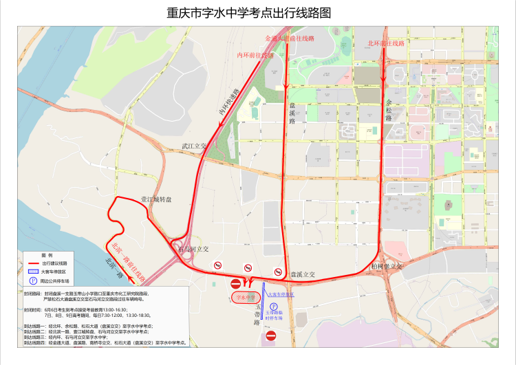 线路一:经北环、余松路、松石大道(盘溪立交)至字水中学考点;