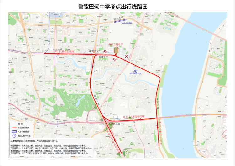 线路一:经黄花园大桥、渝鲁大道、渝鲁立交、新溉大道、凤澜路至鲁能巴蜀中学考点;