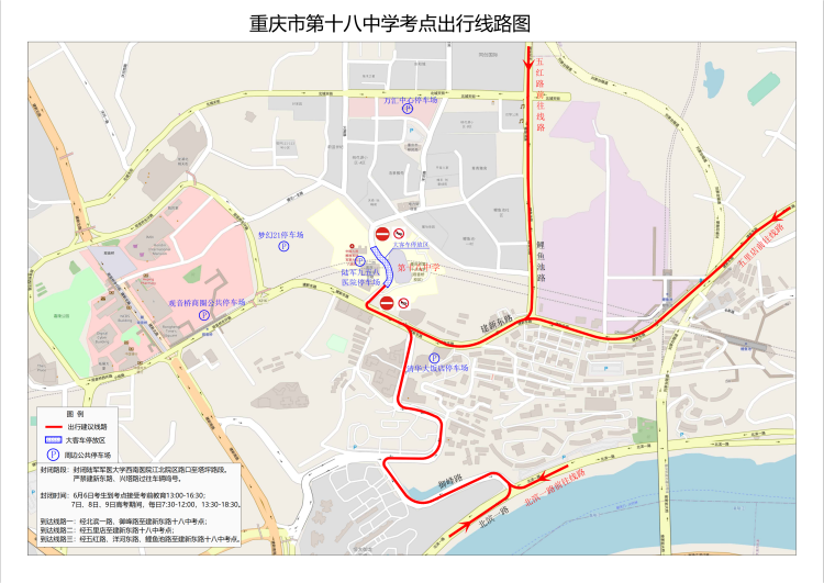 接送考生社会车辆可停放至陆军九五八医院停车场、清华大饭店停车场、梦幻21停车场、万汇中心停车场及观音桥商圈公共停车场。集中送考大客车可有序停放至兴塔路。