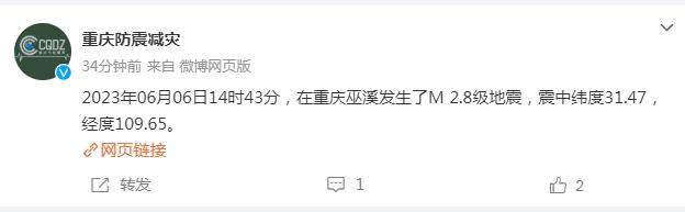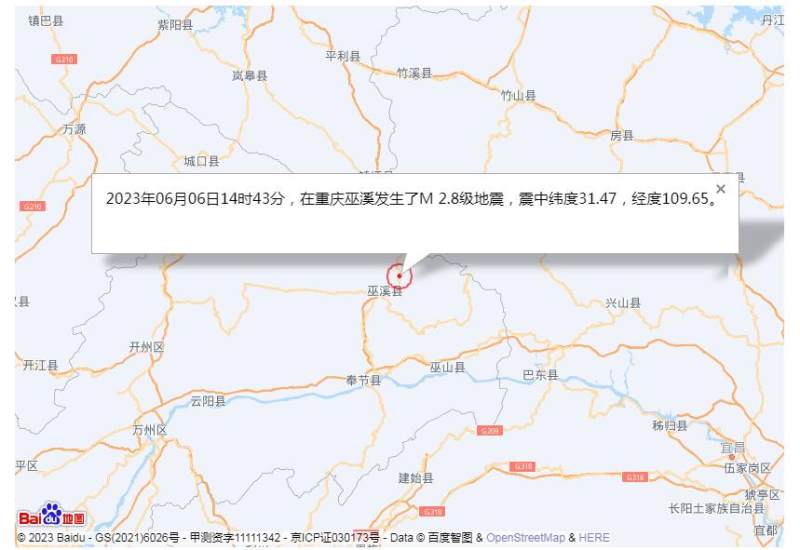@重庆防震减灾 消息,2023年06月06日14时43分,在重庆巫溪发生了M 2.8级地震,震中纬度31.47,经度109.65。