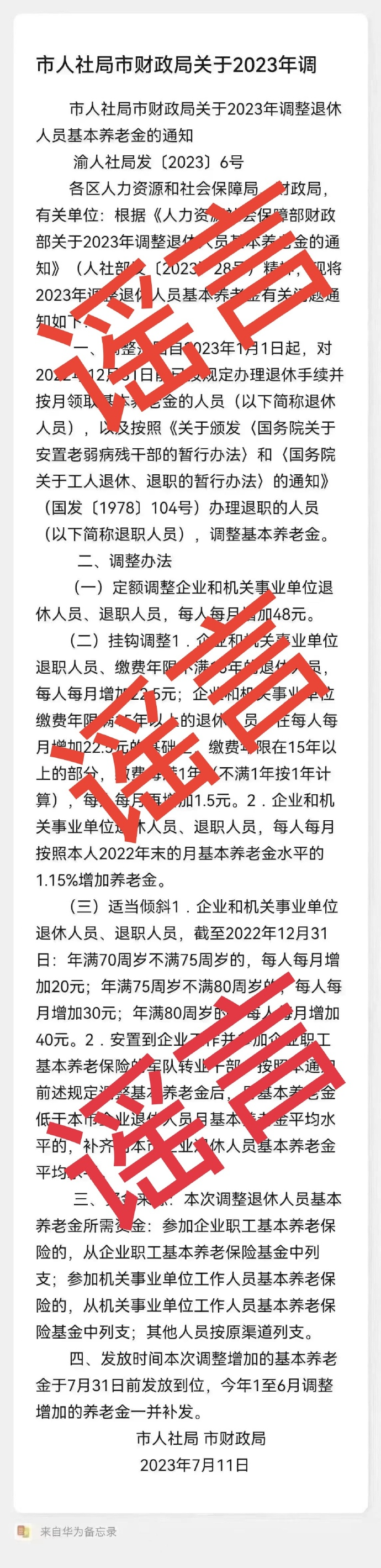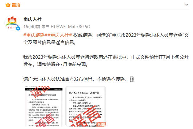 今(19)日,上游新闻从@重庆人社 获悉,网传的“重庆市2023年调整退休人员养老金”文字及图片信息是谣言信息。我市2023年调整退休人员养老待遇政策还在审批中,正式文件预计在7月下旬公开发布,调整待遇在7月底前兑现。请广大退休人员认准官方发布信息,不信谣不传谣。