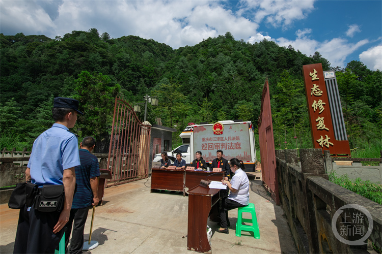 8月10日下午,江津法院将“车载便民法庭”停放在四面山生态修复林旁,开庭审理一起滥伐林木案件。