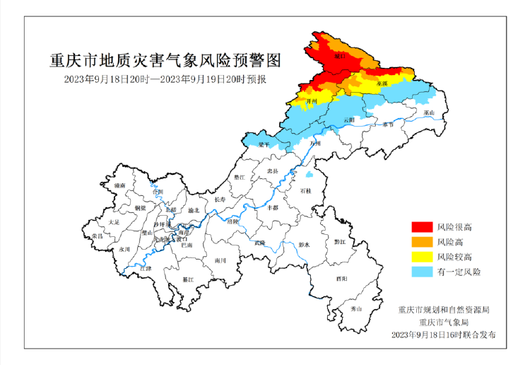 9月18日16时,重庆市规划和自然资源局、重庆市气象局联合发布全市地质灾害气象风险预警。