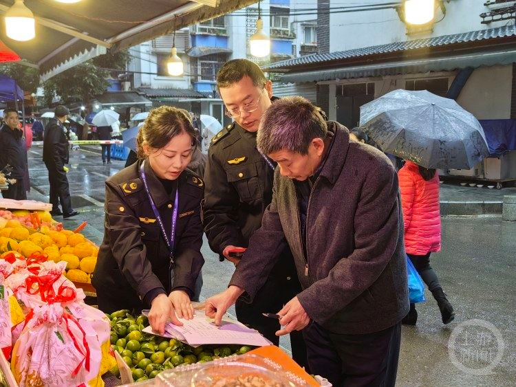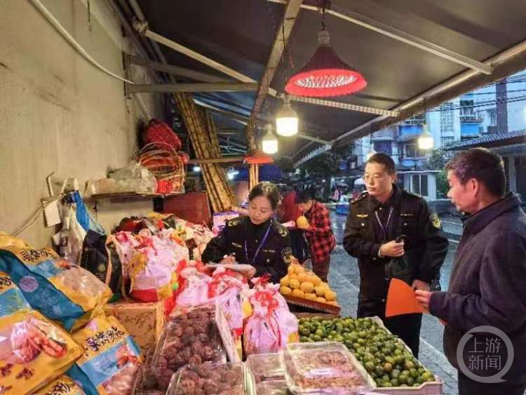 12月1日,九龙坡区市场监管局执法人员对埝山苑农贸市场及其周边的经营者进行现场检查,对仍在使用“生鲜灯”的经营者开出了首张罚单,给予警告的行政处罚。
