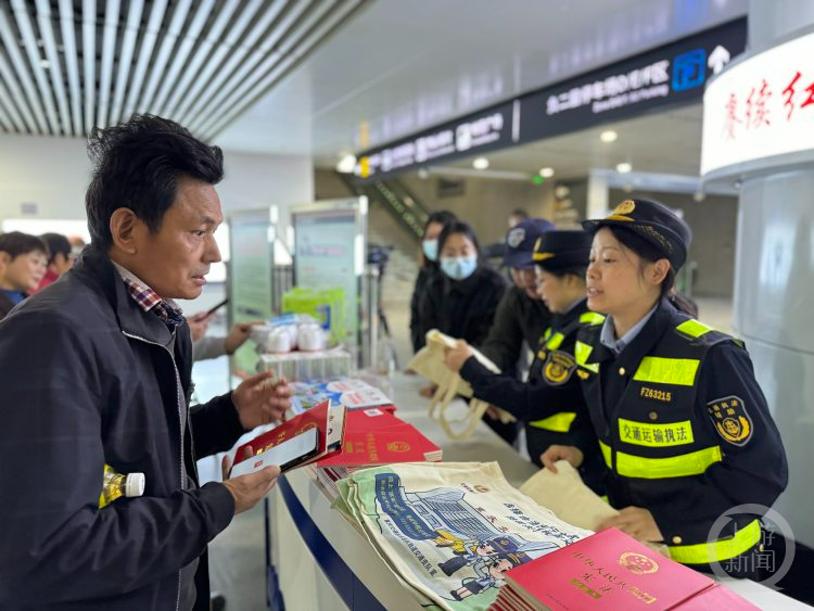 “搭乘地铁时,千万不能扒车门或者自行进入轨行区”“出站请搭乘出租车和正规网约车,千万别坐‘黑车’哦”……12月6日上午,在重庆北站北广场,轨道交通支队执法人员向过往的市民发放宣传单,普及轨道出行安全指南和避坑指南。