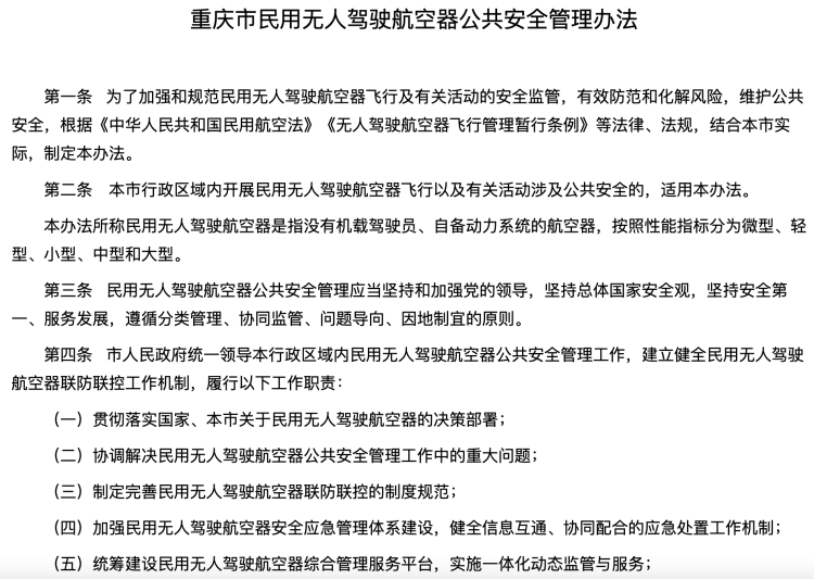 日前,重庆市政府印发《重庆市民用无人驾驶航空器公共安全管理办法》(以下简称《办法》),自2024年2月1日起,重庆市行政区域内的民用无人驾驶航空器所有者应当依法进行实名登记,受到酒精类饮料、麻醉剂或者其他药物影响时,不得操控民用无人驾驶航空器。