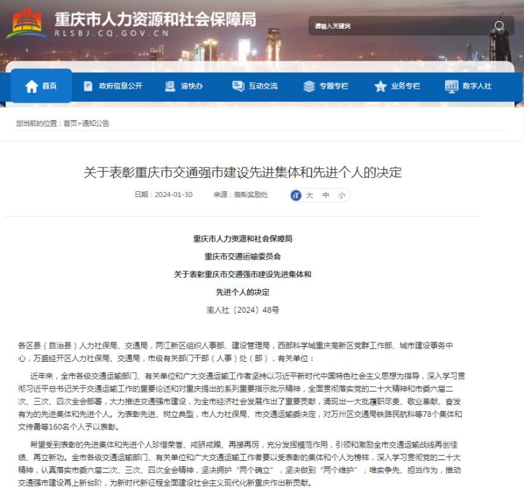 1月30日,据重庆市人力资源和社会保障局官网消息,近年来,重庆市各级交通运输部门、有关单位和广大交通运输工作者大力推进交通强市建设,为全市经济社会发展作出了重要贡献。为表彰先进、树立典型,重庆市人力社保局、重庆市交通运输委于1月25日印发《关于表彰重庆市交通强市建设先进集体和先进个人的决定》,对万州区交通局铁路民航科等78个集体和文传勇等160名个人予以表彰。