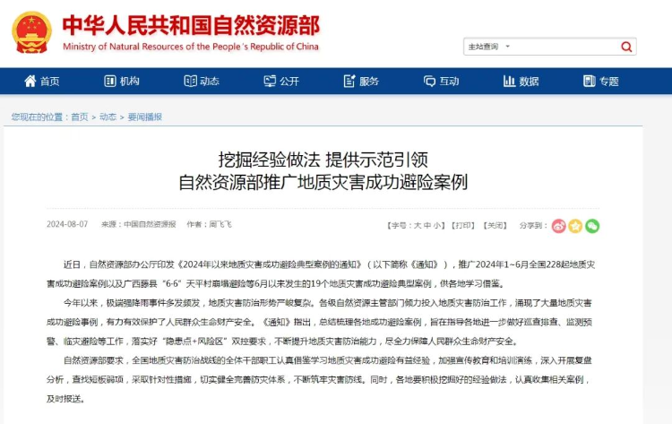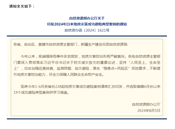 重庆规划自然资源消息,8月6日,自然资源部印发2024年以来地质灾害成功避险典型案例共228个,并筛选出6月以来的19个典型案例供各地学习借鉴,重庆3个案例入选。