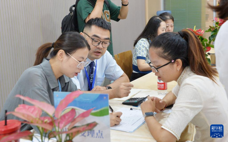 工作人员(左一、左二)在重庆市沙坪坝区井口街道美丽阳光家园社区党群服务中心为市民服务。记者 肖潇 摄/新华社