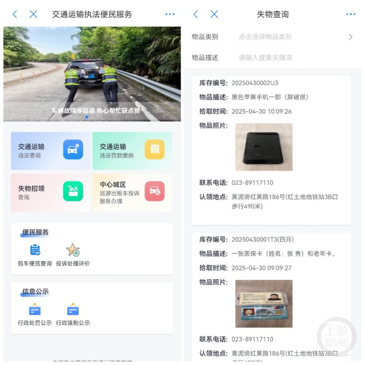 假期期间,市民、游客朋友若不慎在出租车上遗失物品,一是建议拨打12345、(023)89077707联系交通执法部门进行电话挂失,二是可通过“渝快办”APP搜索“交通运输执法便民服务”,或登录重庆交通执法总队微信公众号在服务大厅“电子仓库”查找匹配物品,电子仓库栏显示有物品具体信息、联系电话和认领地点。
