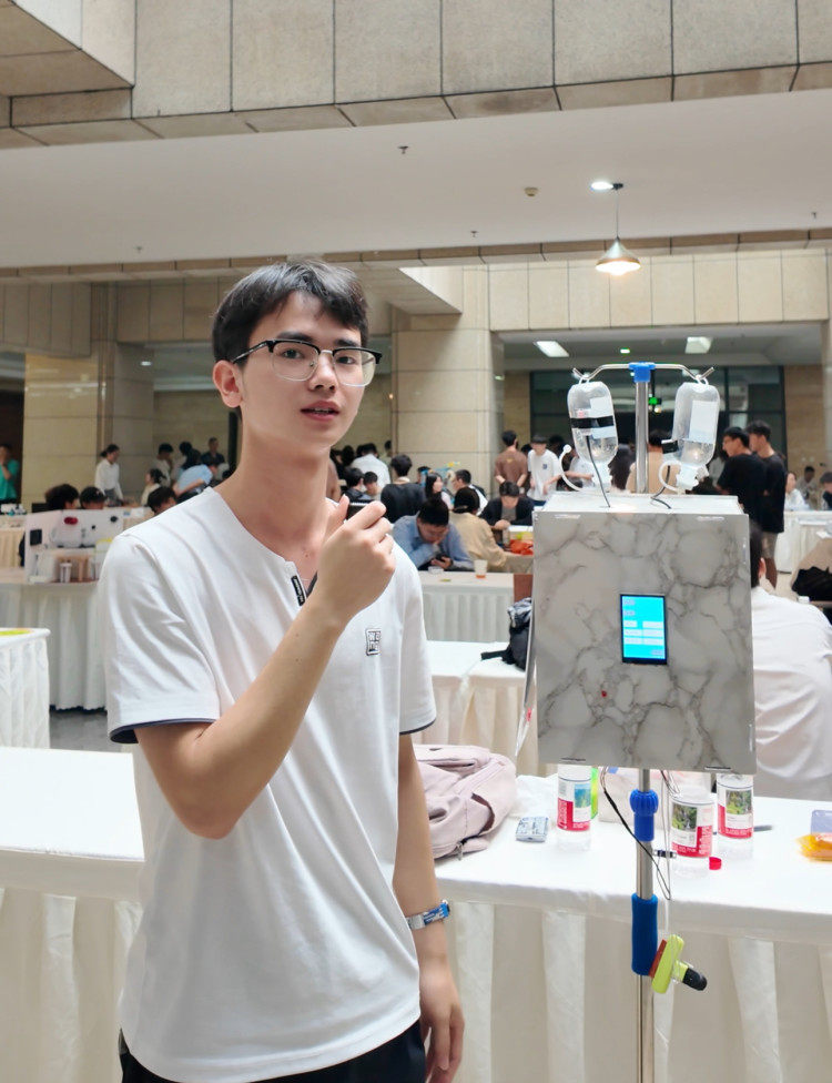 于是,隆岩松带着这个想法回到了学校,并且和团队小伙伴们一起,把这个想法变成了现实。上游新闻记者在比赛现场看到,西南大学参赛团队带来的作品从外观上看是一个金属的长方形盒子,可以固定在输液架上。