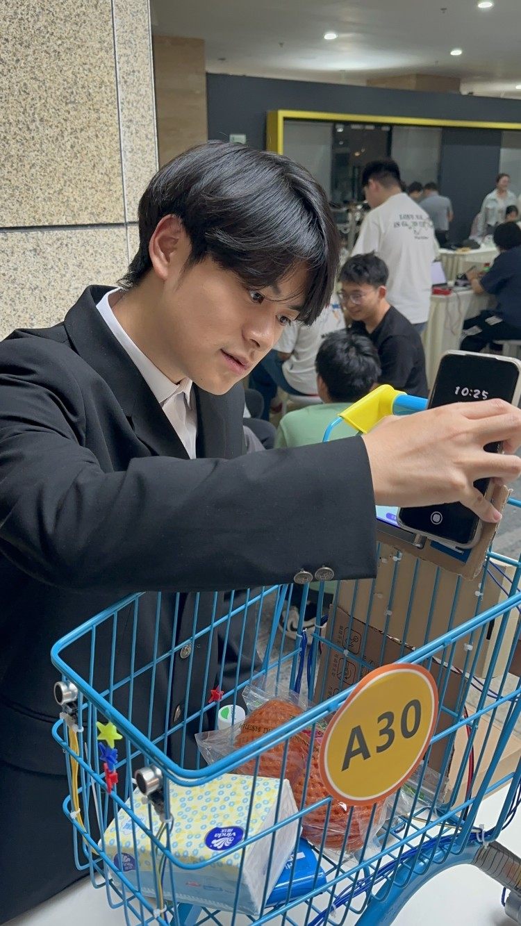 重庆人文科技学院的参赛团队带来的参赛作品是一辆“智能购物车”。“这台购物车可以自动跟随购物者,里面内置了语音助手,可以帮助你寻找想要的货品、咨询商品价格等。”团队学生贺怡忻介绍,购物者购买商品时,只需要轻轻触碰购物车上的装置再放入购物车,便可实现实时计价,购买完成后在购物车上便可完成支付。