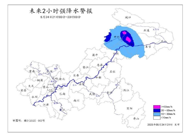 5月24日21时,重庆市气象台发布“未来2小时强降水警报”,根据重庆市气象台预计,5月24日21:00—23:00,开州、云阳等2个区县小时雨强将达50毫米以上,万州、奉节、巫溪等3个区县小时雨强将达10~30毫米,上述地区局地伴有雷电、雷雨大风等强对流天气,请注意防范。
