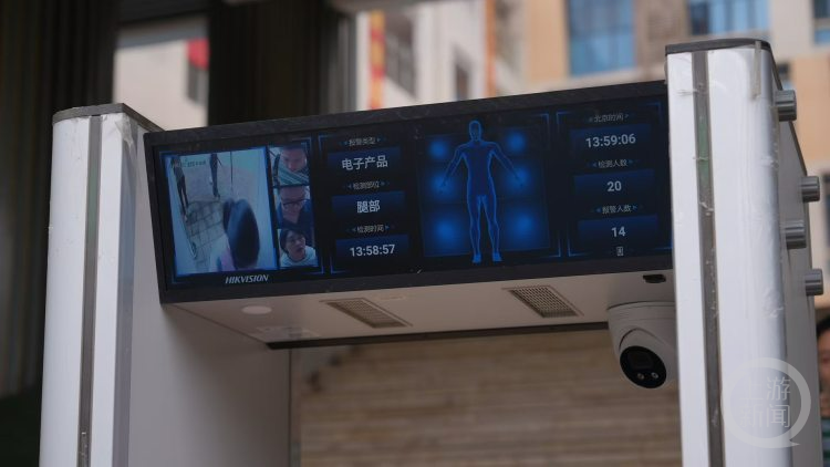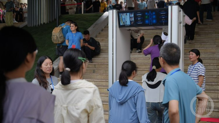 下午2点过,考生们陆续走进校园。入口的两侧学校设置了4道智能安检门,进入考场前,所有考生将经过此门。除了须通过智能安检门检查,进入考场时还须接受人工安检,考生才能进入考场。