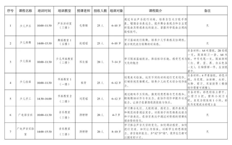 培训班开设少儿声乐、少儿街舞、少儿版画、少儿绘画、少儿手工、广电语言班、广电声音实验室等7门课程,计划招收160人,4-14周岁的青少年可报名。