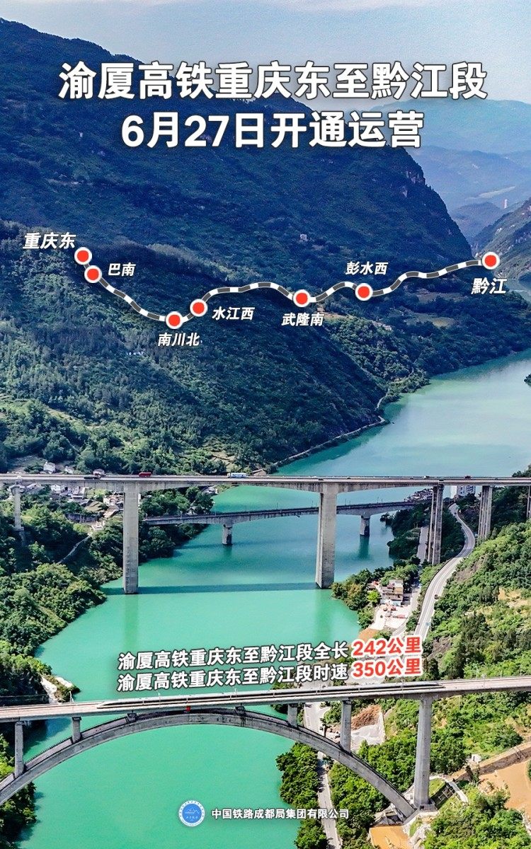 6月25日,中国铁路发布消息,新建重庆至厦门高速铁路(以下简称渝厦高铁)重庆东至黔江段将于6月27日开通运营,渝厦高铁重庆东至长沙段全线贯通,重庆至长沙最快3小时53分可达,旅行时间大幅压缩,成渝地区双城经济圈与长株潭城市群间联系更加紧密,将为沿线经济社会发展注入强劲动能。