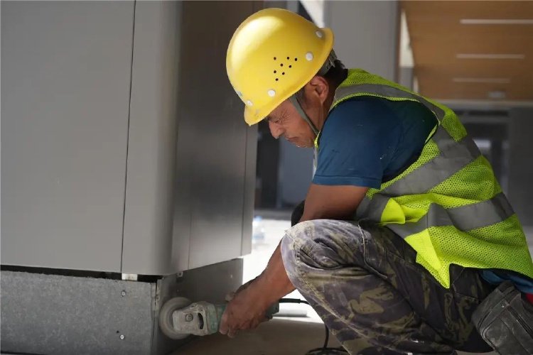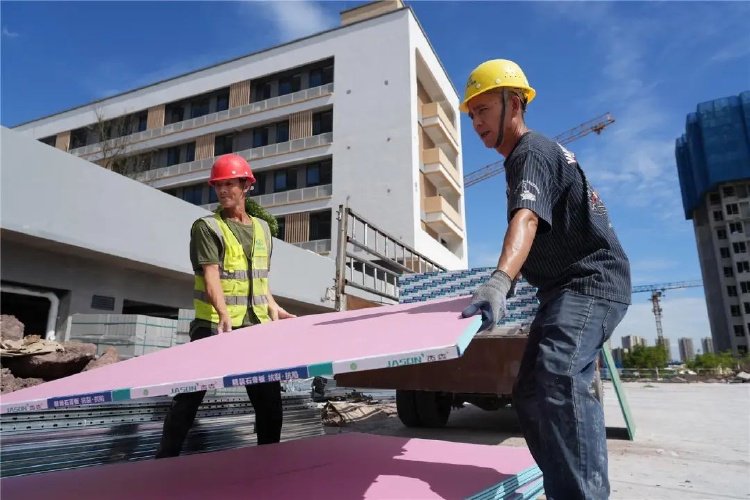 记者在施工现场看到,工人们正在进行外立面喷漆、室外石材铺装及操场铺装等。