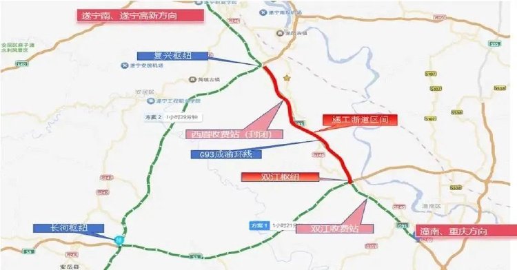 潼南、重庆至遂宁南、遂宁高新方向车辆:经G93成渝环线高速潼南、重庆→双江枢纽(安岳方向匝道)→合安高速→长河枢纽(遂宁方向匝道)→S41遂宜毕高速→复兴枢纽(遂宁南、遂宁高新方向匝道)→遂宁南、遂宁高新方向。