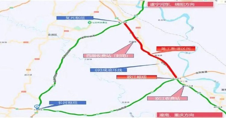 遂宁河东、绵阳方向至潼南、重庆方向车辆:G93成渝环线(遂宁河东、绵阳方向)→S41遂宜毕高速→长河枢纽(潼南方向匝道)→合安高速→双江枢纽(潼南、重庆方向匝道)→G93成渝环线高速潼南、重庆方向。