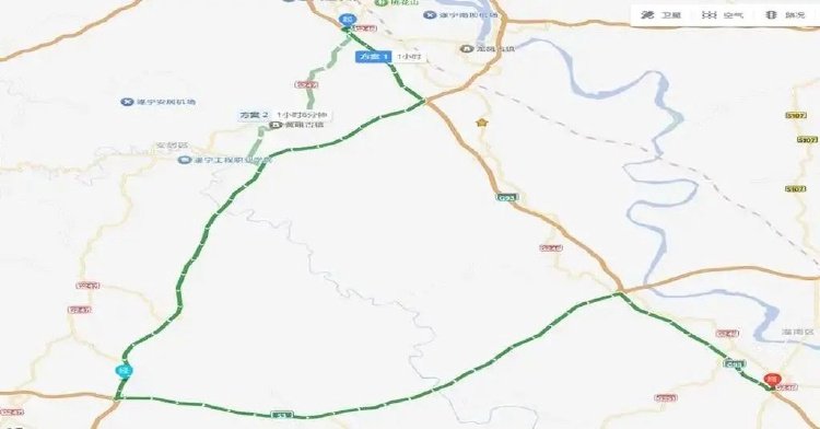 遂宁南、遂宁高新至潼南、重庆方向车辆:遂宁南、遂宁高新方向→复兴枢纽(安岳、内江方向匝道)→S41遂宜毕高速→长河枢纽(潼南方向匝道)→合安高速→双江枢纽(潼南、重庆方向匝道)→G93成渝环线高速潼南、重庆方向。