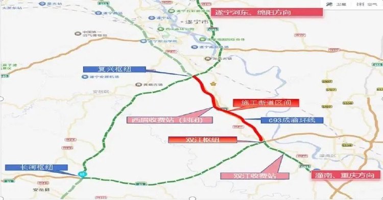潼南、重庆至遂宁河东、绵阳方向车辆:经G93成渝环线高速潼南、重庆→双江枢纽(安岳方向匝道)→合安高速→长河枢纽(遂宁方向匝道)→S41遂宜毕高速→G93成渝环线(遂宁河东、绵阳方向)。