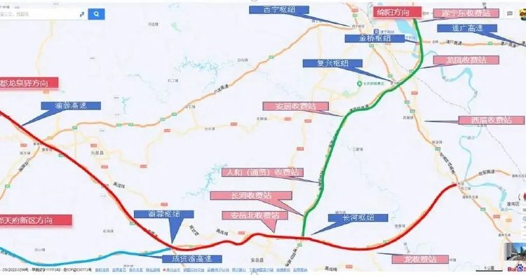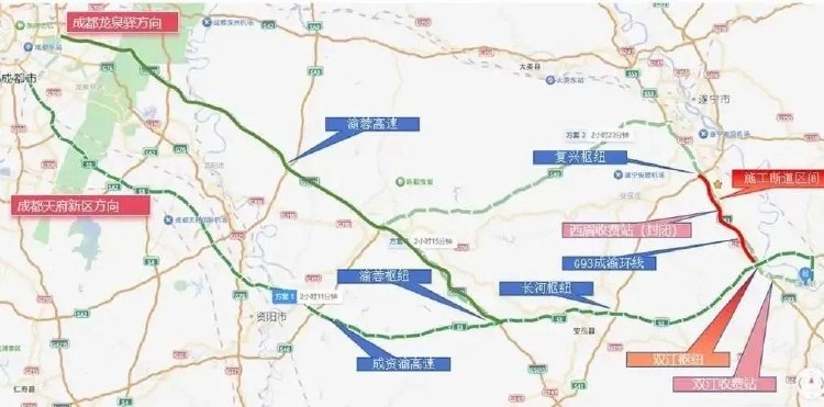潼南、重庆至成都方向车辆:从潼南、重庆→双江枢纽(安岳方向匝道)→合安高速→长河枢纽(成都、资阳方向)→渝蓉高速→成都。