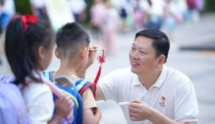 校门口的“328”广场前,学校党总支书记杨永财、校长万李等校领导和老师们早已等候在那里,手中端着盛有朱砂的小盘,脸上满是温柔的笑意。