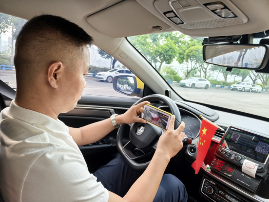 9月3日上午,重庆市租第二分公司驾驶员王彪早早地将出租车停放至安全区域,用手机在车内观看直播。作为一名退役17年的边防军人,他肃然危坐,显得格外激动。上游新闻记者 甘侠义