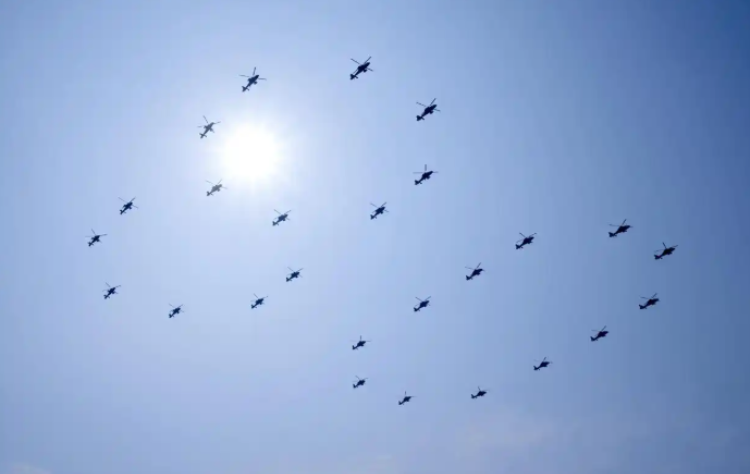 阅兵现场,为战鹰助力,为胜利续航,加受油机梯队飞临天安门上空,三架运油-20A时刻准备为轰-6N、歼-16、歼-20飞机加油。
