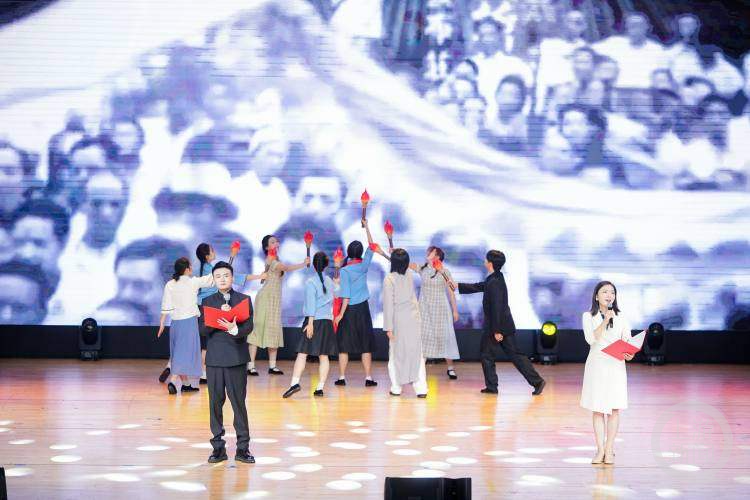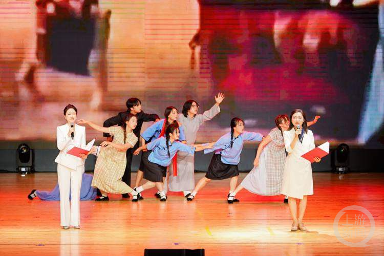 “宝塔巍巍举星火,延河潺潺润中华。你从陕北来到雾的山城,身披硝烟,一路霞光……”重庆广电主持人秦晓英、刘一霏、方嘉怡与求精中学学生张迈共同诵出《红岩村颂》的开篇。