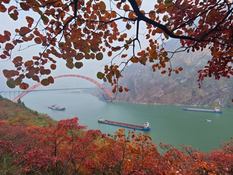船只航行在红叶映衬下的巫山县长江三峡巫峡段。特约摄影 王忠虎