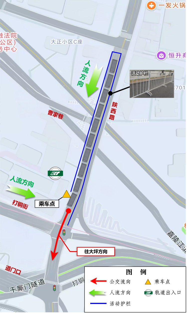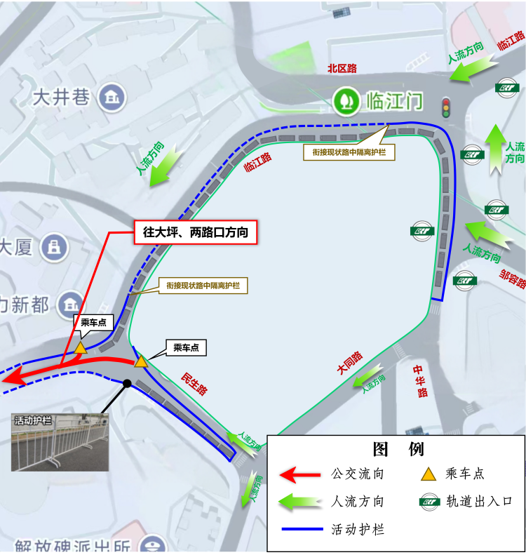 为确保人员安全有序离场,请前往轨道及公交乘车点乘车的市民,注意观察沿线指示牌,服从现场安保及调度人员指挥,切勿翻越隔离设施引发人车混行及踩踏风险。