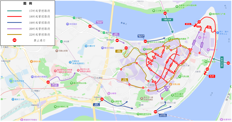 18:00起,禁止车辆通行解放碑片区的八一路、中华路、邹容路、五一路、五四路、江家巷、来龙巷、邹容支路、正阳街、新华路(小什字路口往人民公园路口方向)、磁器街,及朝天门片区的长江滨江路湖广会馆立交下口至嘉陵江滨江路朝千立交(双向)、信义街、来福士连接道(陕西路新华路路口至长江滨江路路口)。