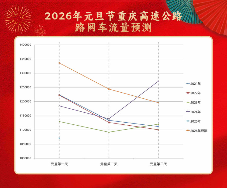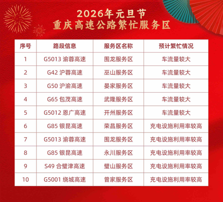 元旦小长假即将到来。重庆高速集团发布消息,预计2026年元旦期间全路网车流量约378万辆次,1月1日达到单日出行最高峰,预计车流量约133万辆次。为方便广大市民安全便捷出行,重庆高速集团制定了出行服务指南。