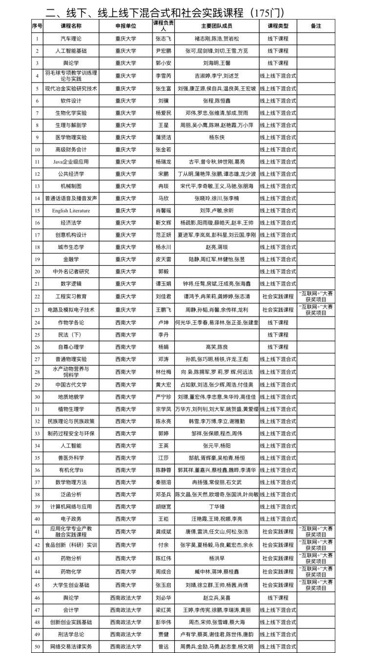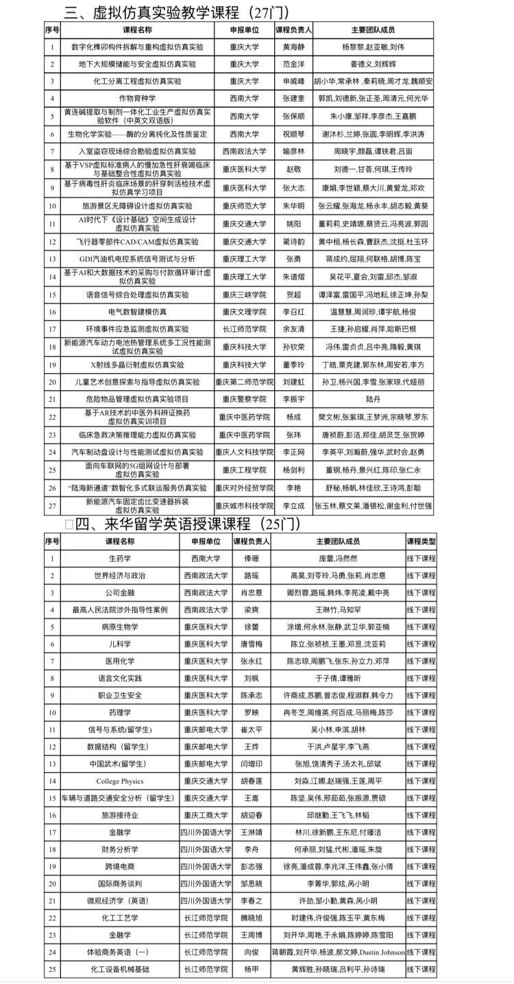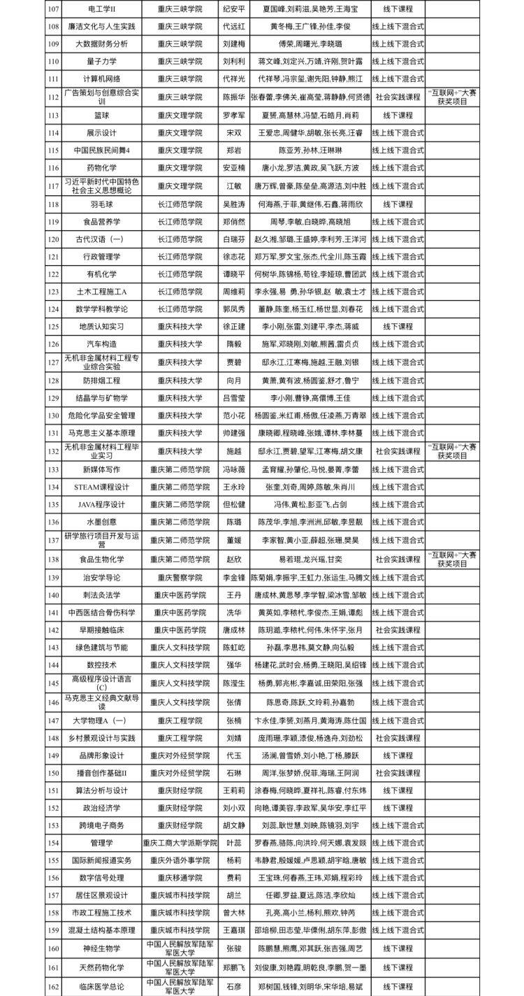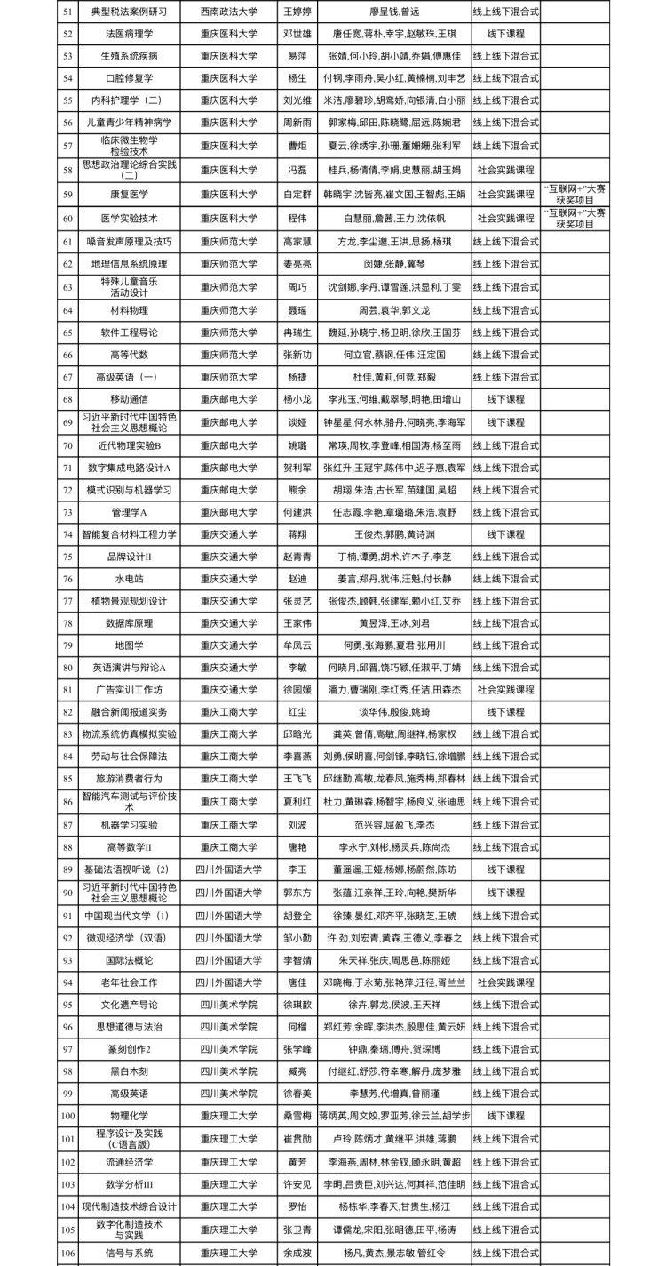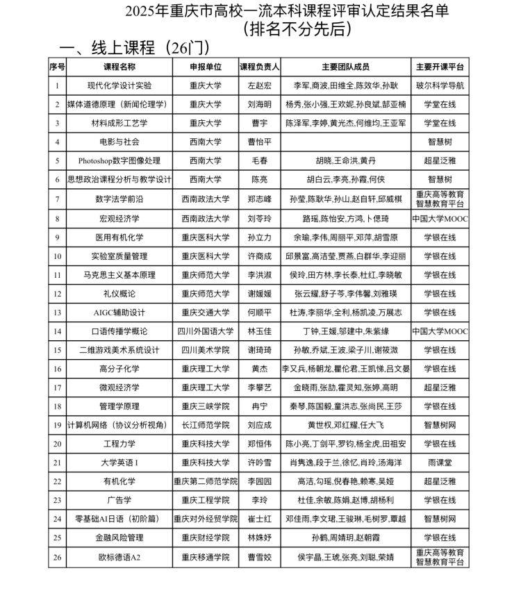 其中,26门线上课程中,重庆大学的现代化学设计实验、媒体道德原理(新闻伦理学)、材料成形工艺学等3门线上课程入选,西南大学的电影与社会、photoshop数字图像处理、思想政治课程分析与教学设计等3门课程入选,西南政法大学、重庆医科大学、重庆师范大学各有2门线上课程入选,此外,还有重庆交通大学、四川外国语大学、四川美术学院、重庆理工大学等高校的多门课程入选。