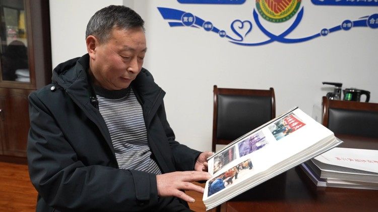 翻看普法老照片的李光明。 摄影记者 邹飞