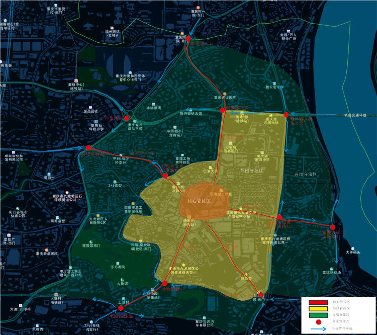 核心管控区:在杨家坪环道西郊路口、杨九路口、珠江路出口、团结路口、九龙泉路口、谢家湾正街路口、珠江路进口、石坪桥正街路口、冶金三支路口、前冶路口、万象大道等地布置警力,控制进入杨家坪、万象城商圈核心区域整体流量,同时保证杨家坪商圈环道、万象城商圈周边的安全、有序、畅通;