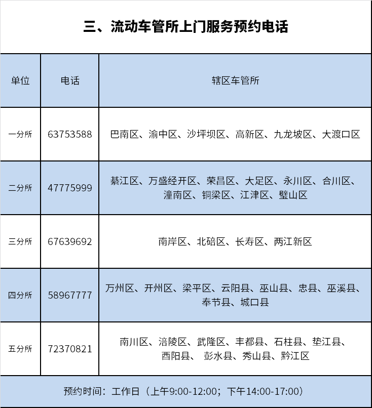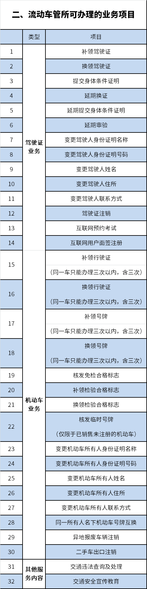 注:具体办理业务项目请向流动车管所现场工作人员咨询。