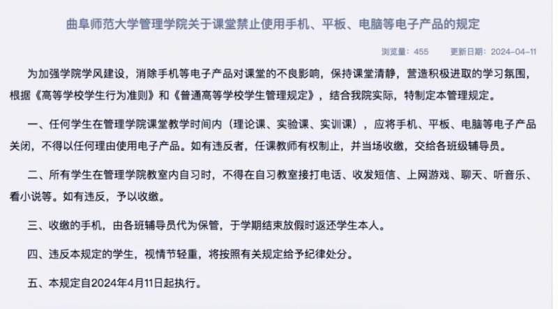 按照校方规定,推出“禁令”是为了加强学风建设,消除手机等电子产品对课堂的不良影响,保持课堂清静,营造积极进取的学习氛围。而且,“禁令”的覆盖面很广,“任何学生在管理学院课堂教学时间内(理论课、实验课、实训课),应将手机、平板、电脑等电子产品关闭,不得以任何理由使用电子产品。如有违反者,任课教师有权制止,并当场收缴,交给各班级辅导员。此外,所有学生在管理学院教室内自习时,不得在自习教室接打电话、收发短信、上网游戏、聊天、听音乐、看小说等。如有违反,予以收缴。”当然,校方也规定,在合适的时机,可以归还,“收缴的手机,由各班辅导员代为保管,于学期结束放假时返还学生本人”。