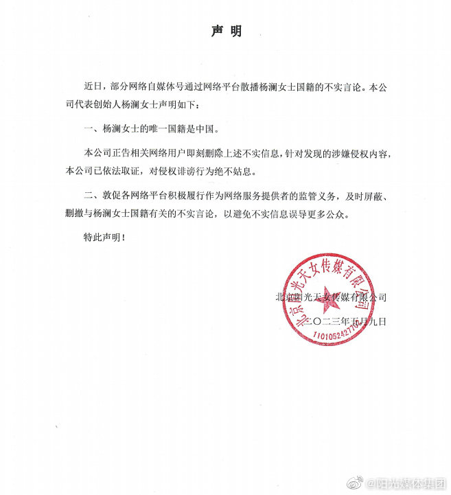 声明提到,杨澜女士的唯一国籍是中国。阳光媒体集团正告相关网络用户即刻删除上述不实信息,针对发现的涉嫌侵权内容,已依法取证,对侵权诽谤行为绝不姑息。