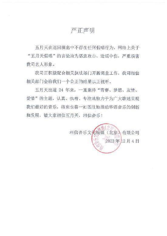 12月4日消息,五月天经纪公司相信音乐文化发布声明,回应“五月天巡回演出中假唱”事件。全文如下: