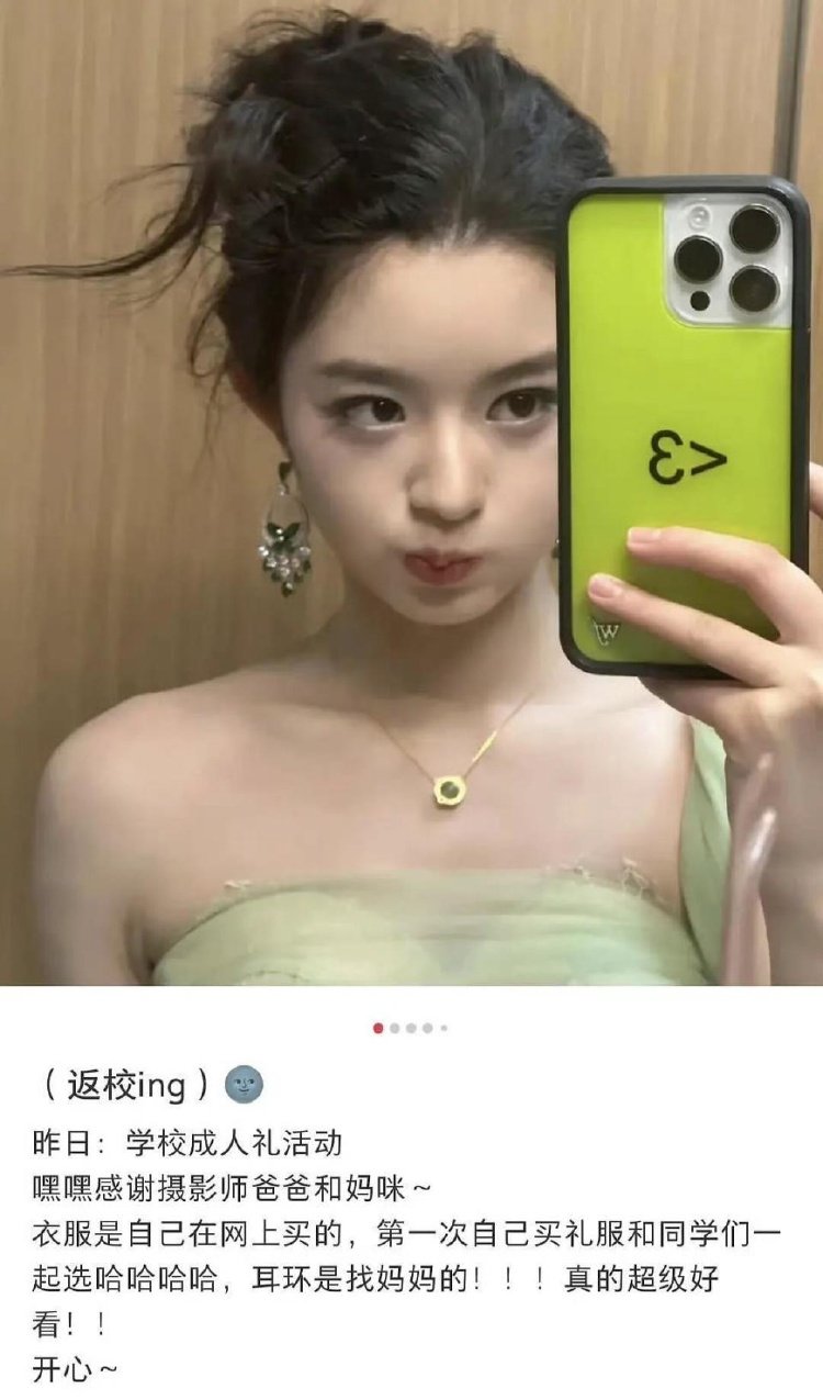 黄杨钿甜所拍的这组照片,是为了纪念参加学校的成人礼活动。她还特意写道,自己所戴的耳环是妈妈的,“真的超级好看!”