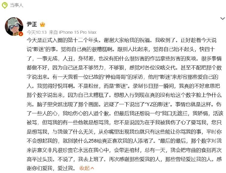 尹正道歉称:快四十了,一事无成,为自己将粉丝称为“影迷”而引发的争议道歉,并真诚感谢过去以及如今依旧爱自己的人。