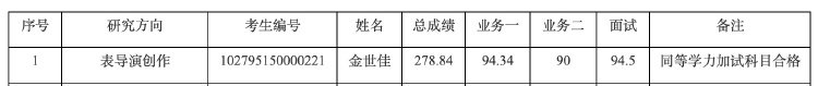 复试名单显示,黄晓明的报考研究方向为“艺术管理/戏剧策划”,金世佳的报考研究方向为“表导演创作”,两者均备注“同等学力加试”。