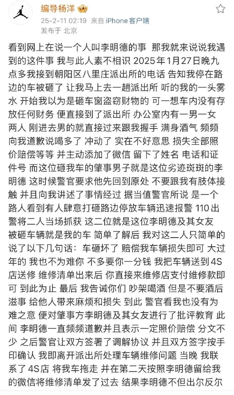 此前,一位账号名为“编导杨洋”的网友发文控诉演员李明德,称1月27日,其停在路边的车被李明德打砸,前期李明德承诺照价赔偿且态度诚恳,车主杨洋与李明德签署调解协议,将维修清单发给对方后,却遭李明德反悔。