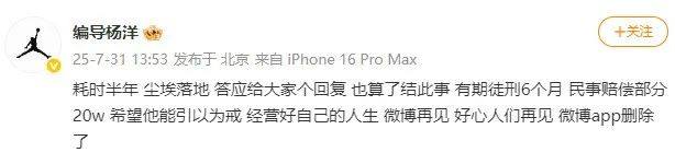 车主@编导杨洋 发文称:“耗时半年,尘埃落地,答应给大家个回复,也算了结此事。有期徒刑6个月,民事赔偿部分20w,希望他能引以为戒,经营好自己的人生。”