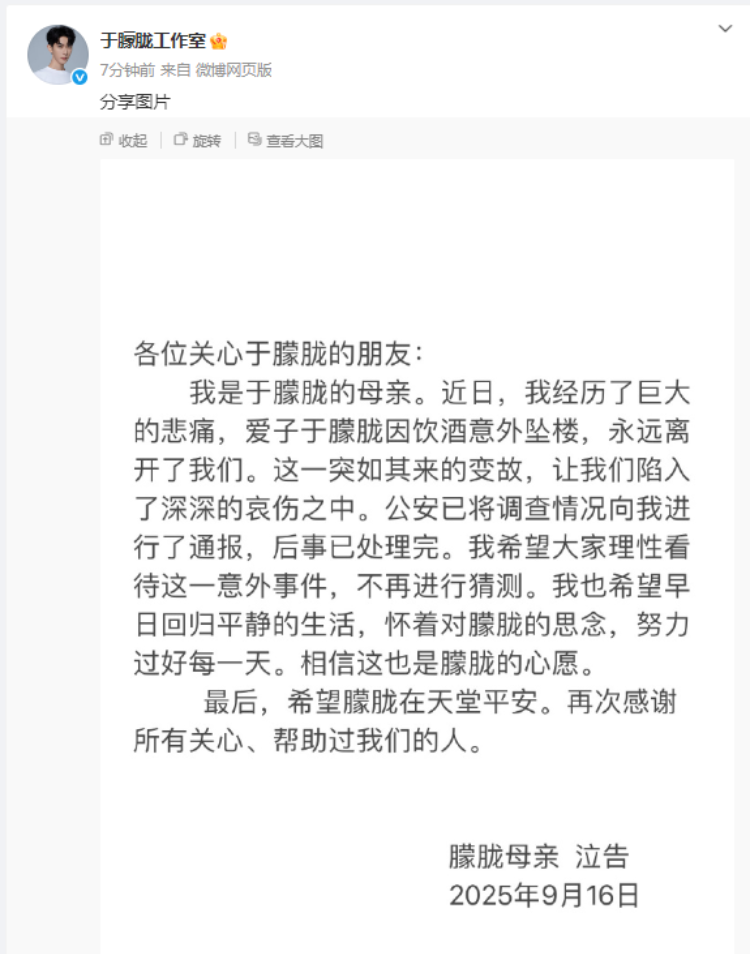 9月16日晚,于朦胧工作室发文,于朦胧母亲称于朦胧系饮酒意外坠楼。